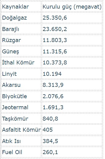 Geçen yıl elektrik kurulu gücü içindeki enerji kaynaklarının dağılımı şu şekilde:
