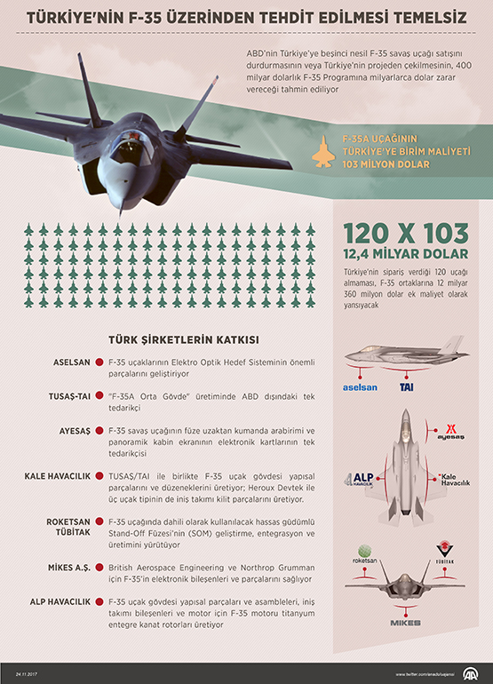 Ancak başından itibaren F-35 programının 9 katılımcısından biri olan Türkiye'nin programda 120 adet geleneksel kalkış ve iniş yapabilen F-35A tipi uçak siparişinin yanı sıra programın ortak parça üreticisi ve motor bakım yüklenicisi olması, Türkiye'yi programın dışına çıkarma ihtimalini oldukça zayıflatıyor.