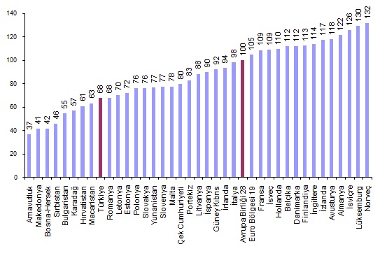 Kişi başına fiili bireysel tüketim düzeyi 28 Avrupa Birliği ülkesi ortalaması 100 iken, Türkiye için 68 oldu ve AB ortalamasının %32 altında kaldı. Karşılaştırmalarda yer alan 37 ülke arasında kişi başına fiili bireysel tüketim değeri en yüksek ülke 132 ile Norveç, en düşük ülke ise 37 ile Arnavutluk oldu.