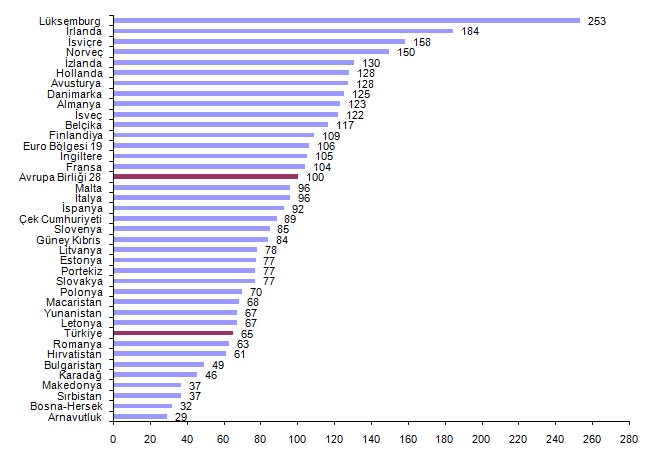 Avrupa Birliği İstatistik Ofisi (Eurostat) tarafından açıklanan Satınalma gücü paritesine (SGP) göre kişi başına gayri safi yurt içi hasıla (GSYH) endeksi 2017 yılı geçici sonuçlarına göre 28 Avrupa Birliği (AB) ülkesi ortalaması 100 iken, bu değer Türkiye için 65 oldu ve AB ortalamasının yüzde 35 altında kaldı.
