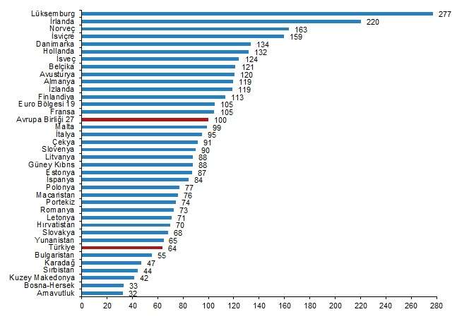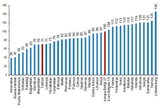 Kişi başına fiili bireysel tüketim düzeyi 27 Avrupa Birliği ülkesi ortalaması 100 iken, Türkiye için 71 oldu ve AB ortalamasının %29 altında kaldı. Karşılaştırmalarda yer alan 36 ülke arasında kişi başına fiili bireysel tüketim değeri en yüksek ülke 146 ile Lüksemburg, en düşük ülke ise 39 ile Arnavutluk oldu.