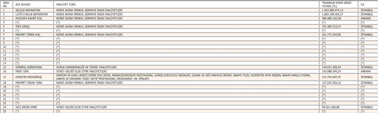 En fazla gelir vergisi beyan eden mükellef listesinin ilk sırasındaki rekortmen Baykar Yönetim Kurulu Başkanı Selçuk Bayraktar oldu. Bayraktar'a, 2023 yılında 1 milyar 952 milyon 680 bin 474,13 lira vergi tahakkuk etti.