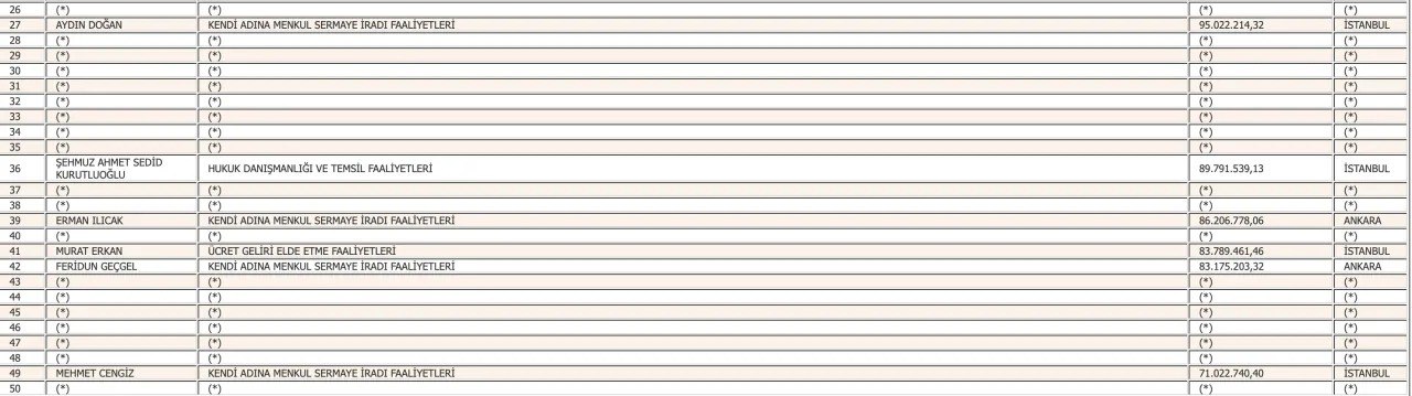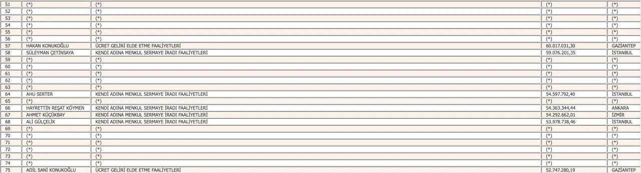 Listenin 4, 6, 8, 9 ve 10'uncu sırasındaki mükellefler isimlerinin açıklanmasını istemezken, 5'inci sırada 323 milyon 300 bin 723,37 lira ile İpek Kıraç, 7'inci sırada ise 261 milyon 773 bin 294,9 lira ile Mehmet Ömer Koç yer aldı.