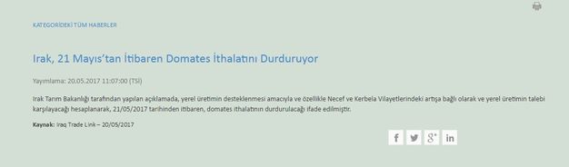 Irak Tarım Bakanlığı'nın açıklaması, Türkiye Cumhuriyeti Ekonomi Bakanlığı'nın internet sitesinde de yer aldı.