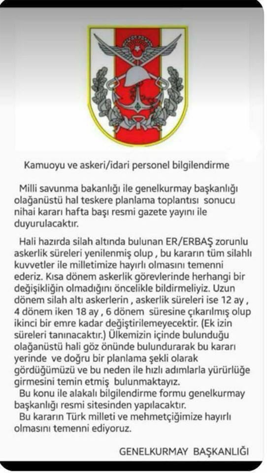''Milli Savunma Bakanlığı ile Genelkurmay Başkanlığı olağanüstü hal teskere planlama toplantısı sonucu nihai kararı hafta başı resmi gazete yayını ile duyurulacaktır. Hali hazırda silah altında bulunan ER/ERBAŞ zorunlu askerlik süreleri yenilenmiş olup, bu kararın tüm silahlı kuvvetler ile milletimize hayırlı olmasını temenni ederiz.