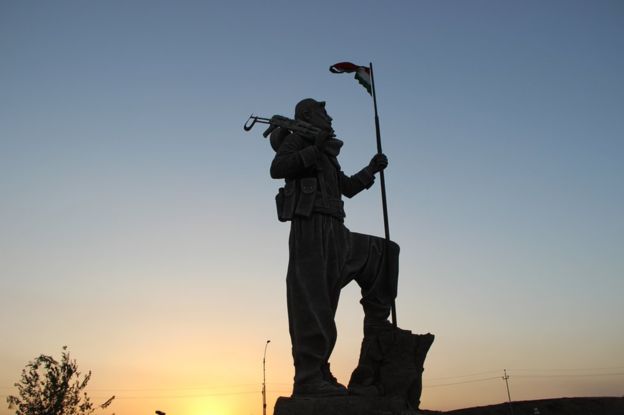 Yapımı henüz bitmiş ve IŞİD'le mücadele ölen Peşmergeler için yapıldığı belirtilen heykelin elinde yine büyük bir Irak Kürdistan Bölgesel Yönetimi (IKBY) bayrağı var.