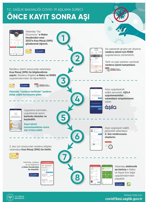 Aşı randevuları MHRS.GOV.TR sistemi ve ALO 182 üzerinden veriliyor.