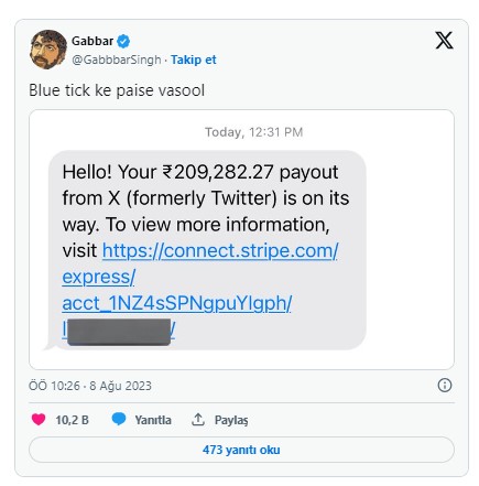 Örneğin Twitter'da Gabbar adını kullanan Hintli girişimci Abhishek Asthana, platformdan 209 bin 282 rupi (yaklaşık 2 bin 500 dolar) kazandığını yazdı.