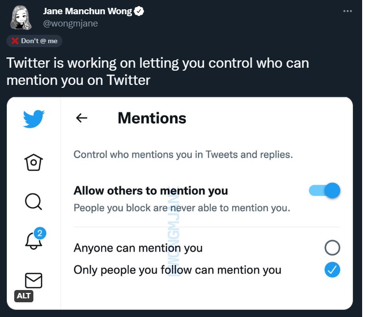 Uygulama araştırmacısı Jane Manchun Wong; platformun, kullanıcılara tweet’lerde ve yanıtlarda kimlerin kendilerinden bahsedebileceğini kontrol etme olanağı vereceğini ileri sürdü. Wong, henüz yayınlanmamış Twitter özelliğinin ekran görüntüsünü de paylaştı.
