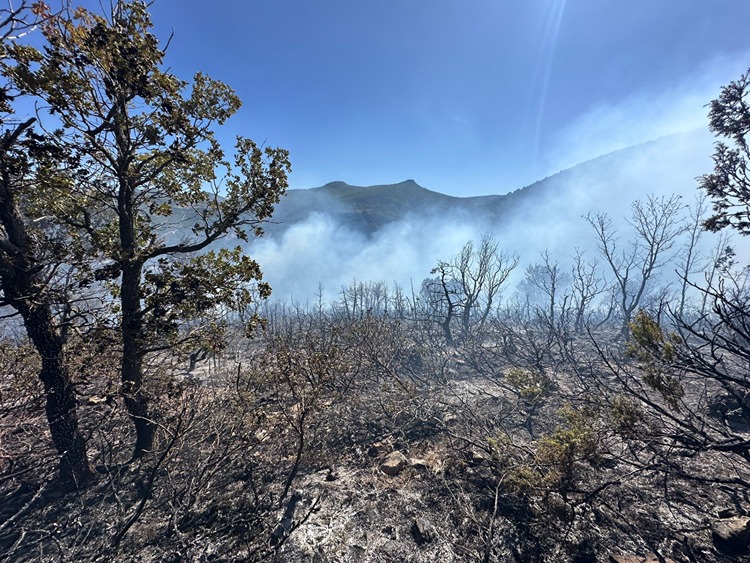 Görüntülerde, geniş bir alanda etkili olan alevlerin çok sayıda ağacı yaktığı ve geride küllerle kaplı, yanmış bir arazi kaldığı görüldü.