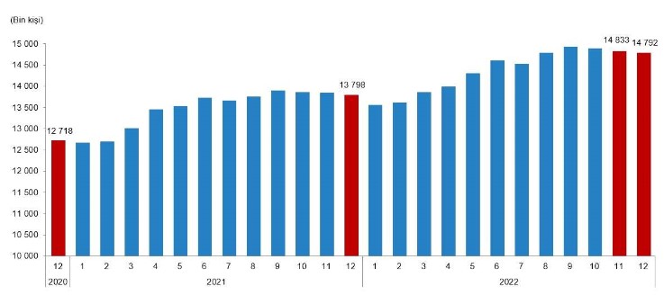 Türkiye İstatistik Kurumu (TÜİK) tarafından yapılan açıklamaya göre, sanayi, inşaat ve ticaret-hizmet sektörleri toplamında ücretli çalışan sayısı 2022 Aralık ayında bir önceki yılın aynı ayına göre %7,2 arttı. Ücretli çalışan sayısı bir önceki yılın aynı ayında 13 milyon 797 bin 768 kişi iken, 2022 yılı Aralık ayında 14 milyon 792 bin 228 kişi oldu.