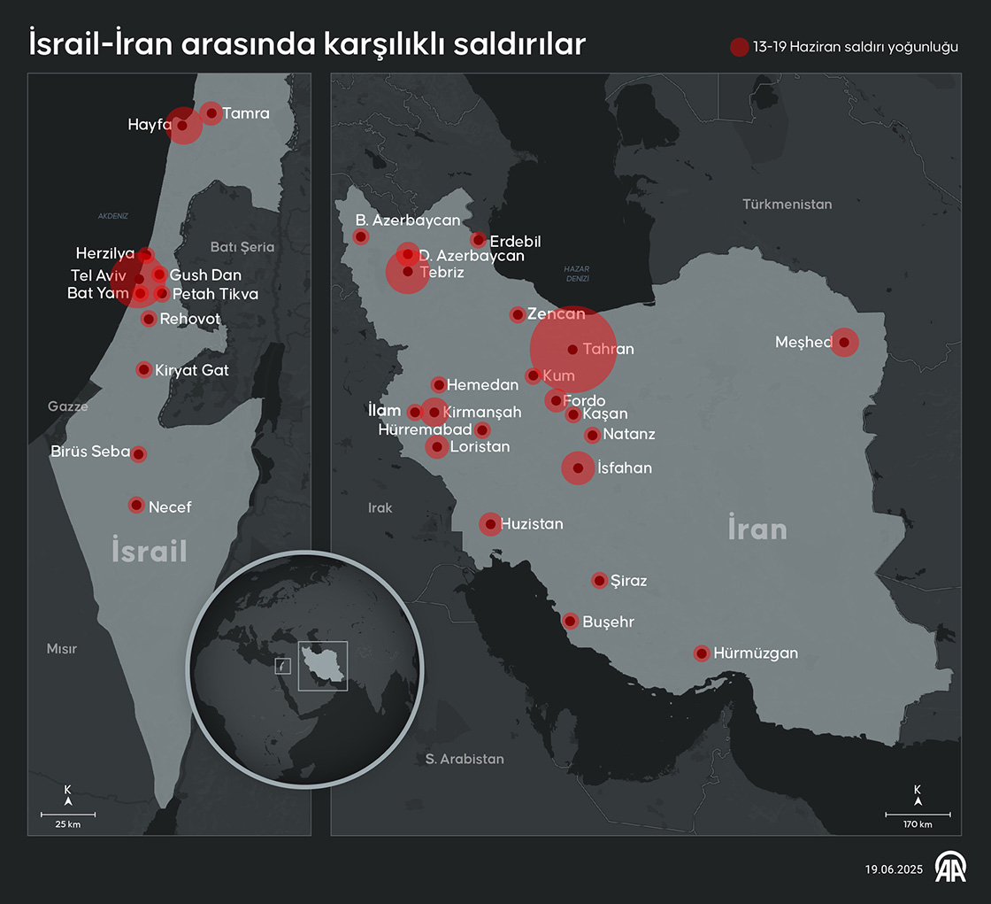 İsrail, başta Tahran, İsfahan, Tebriz, Loristan, Huzistan, Hemedan ve Kum şehirleri olmak üzere birçok kente saldırı düzenledi.
