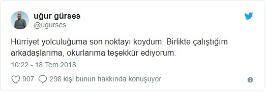 Gazeteden en son ayrılan kişi ekonomi yazarı Uğur Gürses oldu. Gürses, sosyal medya hesabından yaptığı açıklamada "Hürriyet yolculuğuma son noktayı koydum. Birlikte çalıştığım arkadaşlarıma, okurlarıma teşekkür ediyorum" dedi.