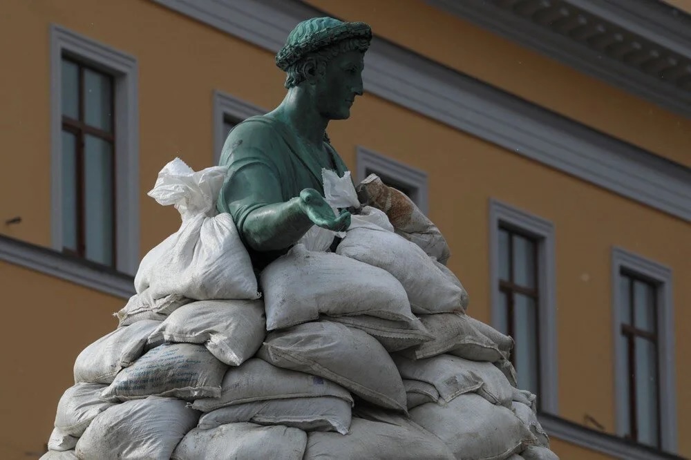 Ajansların yayınladığı fotoğraflara göre bölge halkı olası bir bombalamaya karşı kentin sembol yapılarından Richelieu Heykeli’ni kum torbalarıyla koruma altına aldı.