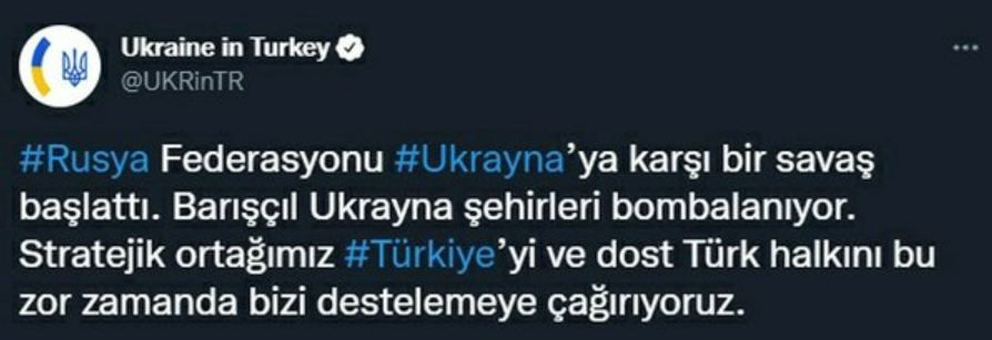 Elçiliğin Twitter hesabından yapılan açıklamada “Rusya Federasyonu Ukrayna’ya karşı bir savaş başlattı. Barışçıl Ukrayna şehirleri bombalanıyor. Stratejik ortağımız Türkiye’yi ve dost Türk halkını bu zor zamanda bizi desteklemeye çağırıyoruz” ifadeleri kaydedildi.