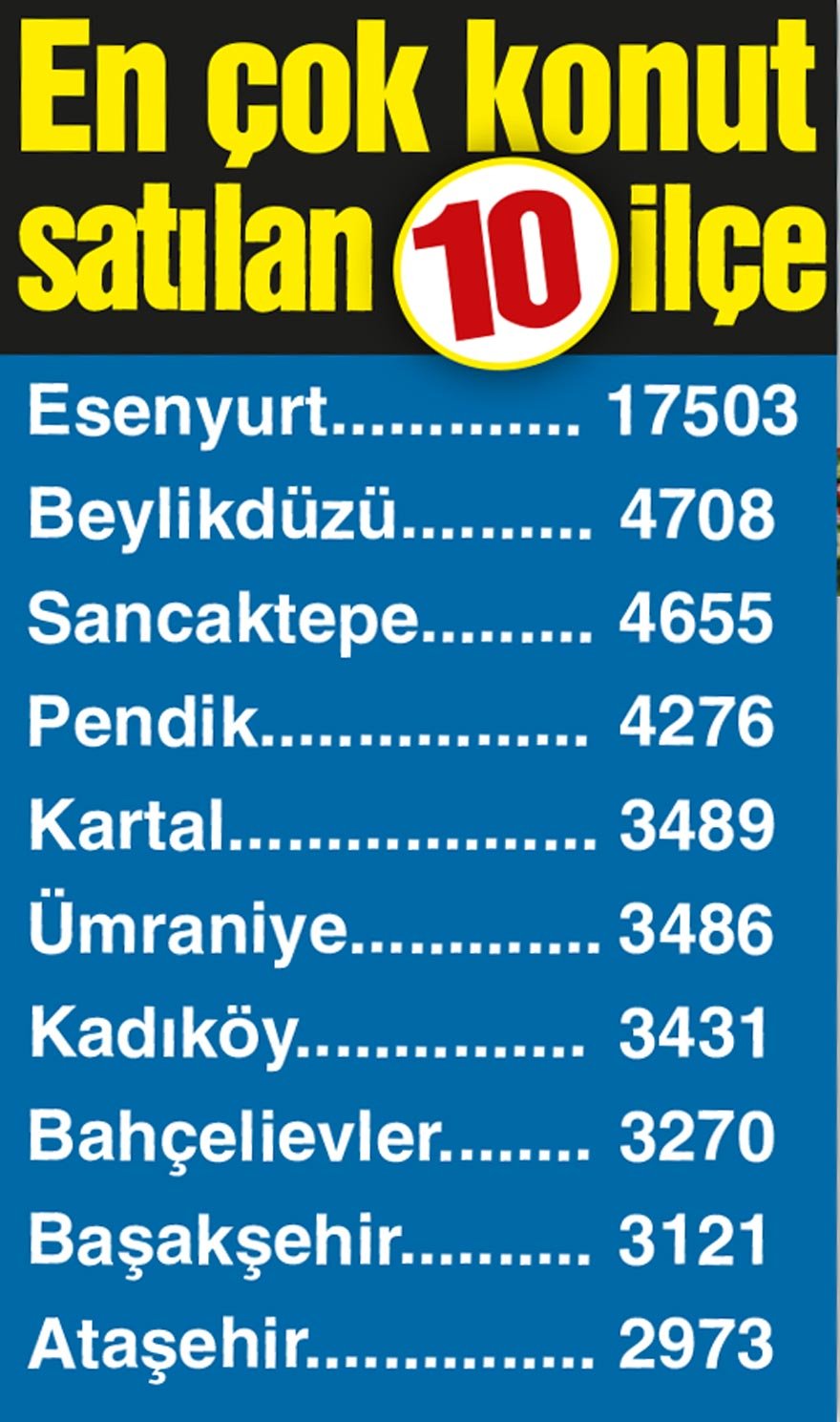 Türkiye İstatistik Kurumu (TÜİK) verilerine göre yılın ilk beş ayında ülke genelinde 556 bin 784 konut el değiştirdi. Ocak – Mayıs döneminde en çok ev 96 bin 386 adetle İstanbul'da satıldı. Mega kentte gayrimenkul piyasasının en hareketli olduğu ilçe 17 bin 503 konut satışıyla Esenyurt oldu. Beylikdüzü 4 bin 708 konut ile ikinci, Sancaktepe 4 bin 655 adetle üçüncü sırada yer aldı. Ocak – Mayıs döneminde, İstanbul'da en az konut 124 adetle Beykoz'da satılırken, bu ilçeyi 200 konutla Beşiktaş ve 747 konutla Beyoğlu takip etti.