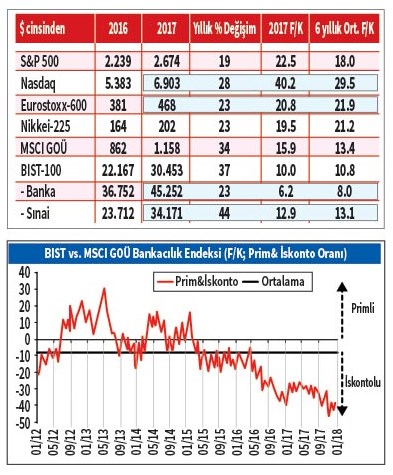 Aşağıdaki grafik, gelişmekte olan ülke borsalarıyla karşılaştırmalı olarak, Türk bankaları hisselerinin, ülkemize olan güvenin azalması nedeniyle, halen %40 oranında ucuz olduğunu ifade ediyor.