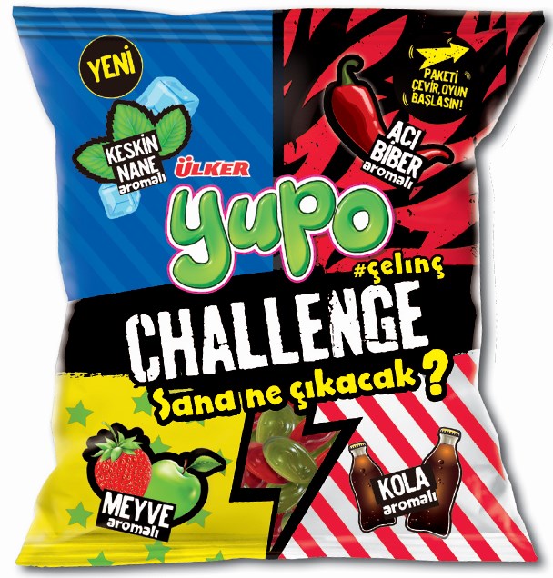 Dijital dünyada popüler olan eğlenceli challenge akımı Türkiye’de ilk kez bir şekerleme ürünüyle birleşti. Acı biber, keskin nane, meyve ve kola aromalı lezzetlerin tek paket içerisinde yer aldığı yeni Yupo Challenge, paketlerinin arkasındaki 5 farklı oyunu 4 farklı jelly ile buluşturuyor. Tek ayağı havada tutup zıplayarak etrafında dönme, ellerini yere koyup masa gibi durma, dizlerini büküp bekleme, gülümsememe gibi paket arkası oyunlarıyla, Yupo herkesi eğlenceye davet ediyor.