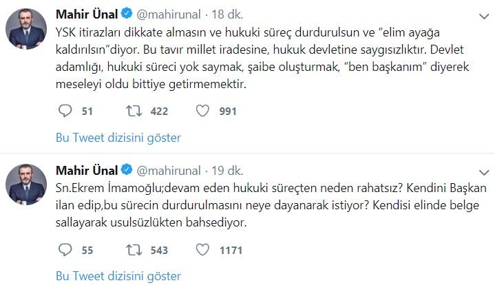 AK Parti Genel Başkan Yardımcısı Mahir Ünal açıklamasında, "Sn.Ekrem İmamoğlu;devam eden hukuki süreçten neden rahatsız? Kendini Başkan ilan edip,bu sürecin durdurulmasını neye dayanarak istiyor? Kendisi elinde belge sallayarak usulsüzlükten bahsediyor. YSK itirazları dikkate almasın ve hukuki süreç durdurulsun ve “elim ayağa kaldırılsın”diyor. Bu tavır millet iradesine, hukuk devletine saygısızlıktır. Devlet adamlığı, hukuki süreci yok saymak, şaibe oluşturmak, “ben başkanım” diyerek meseleyi oldu bittiye getirmemektir" ifadelerine yer verdi.