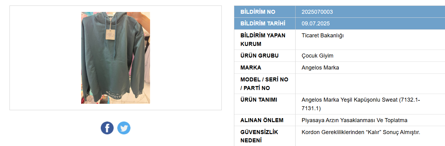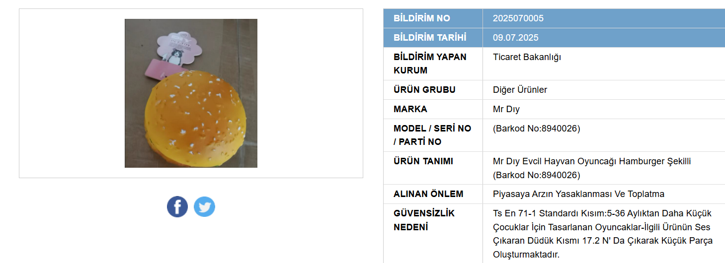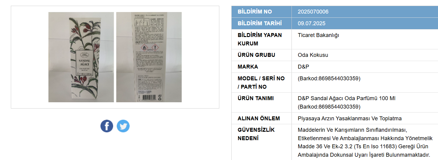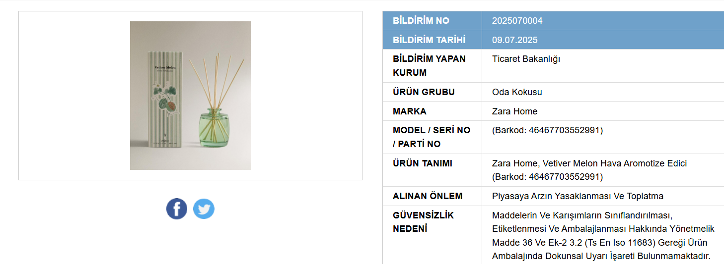 Habertürk’te yer alan habere göre, Ticaret Bakanlığı’nın Güvensiz Ürün Bilgi Sistemi'nde (GÜBİS) yayımlanan denetim sonuçlarına göre, Zara Home’un “Vetiver Melon” oda kokusu, D&P’nin 100 ml Sandal Ağacı Oda Parfümü, Mr Dıy’ın hamburger şekilli evcil hayvan oyuncağı ve Angelos markalı yeşil kapüşonlu sweatshirt için piyasaya arz yasağı ve toplatma kararı alındı.