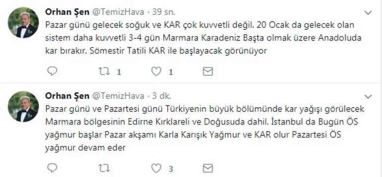 Prof. Şen mesajında, "Pazar günü gelecek soğuk ve kar çok kuvvetli değil. 20 Ocak'ta gelecek olan sistem daha kuvvetli. 3-4 gün Marmara, Karadeniz başta olmak üzere Anadolu'da kar bırakır. Sömestr tatili kar ile başlayacak görünüyor" tahmininde bulundu.