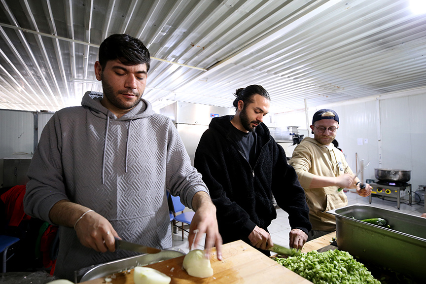 Şefler Yalçınkaya, Sergen Özen, Tahsin Küçük, Burak Kaya ve diğer gönüllülerden oluşan ekip, ilçedeki Gençlik ve Spor Bakanlığına bağlı öğrenci yurdu yemekhanesinde günlük 2 bin kişilik yemek çıkartıyor.