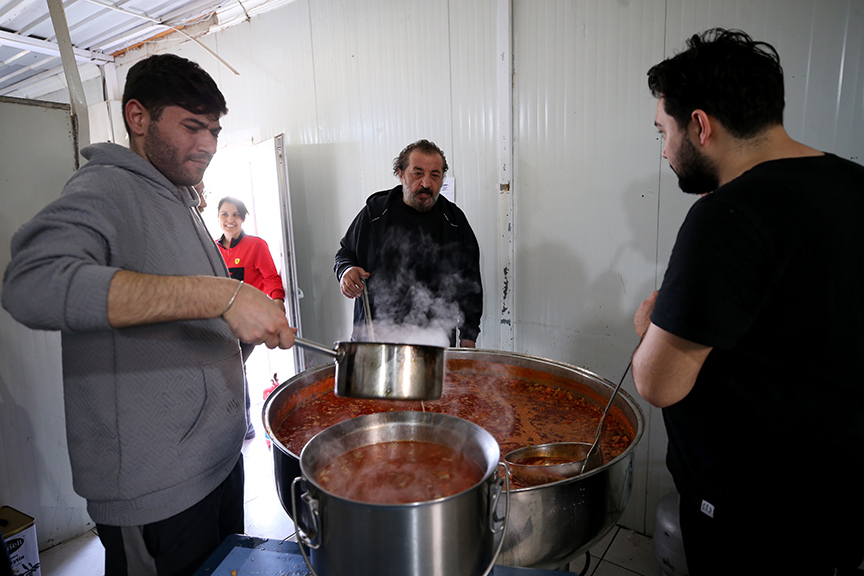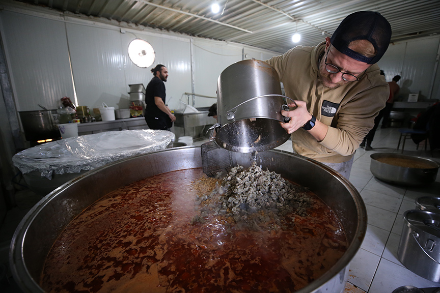 Kahramanmaraş merkezli depremlerden etkilenen Gaziantep'in İslahiye ilçesine gelen şef Mehmet Yalçınkaya ve gönüllü ekibi, depremzedeler için yemek yapıyor.
