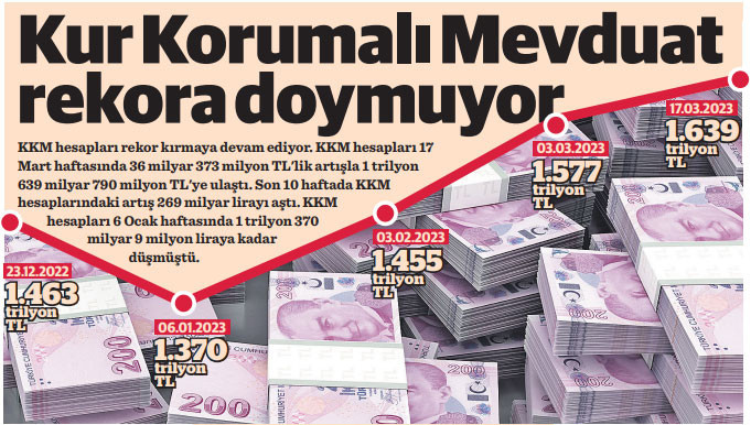 Bankacılık Düzenleme ve Denetleme Kurumu (BDDK), 17 Mart haftasına ilişkin bankacılık verilerini açıkladı. Buna göre söz konusu hafta itibarıyla Kur Korumalı Mevduat (KKM) hesaplarının toplamı 1 trilyon 639 milyar 790 milyon liraya ulaşarak yeni zirvesini gördü.