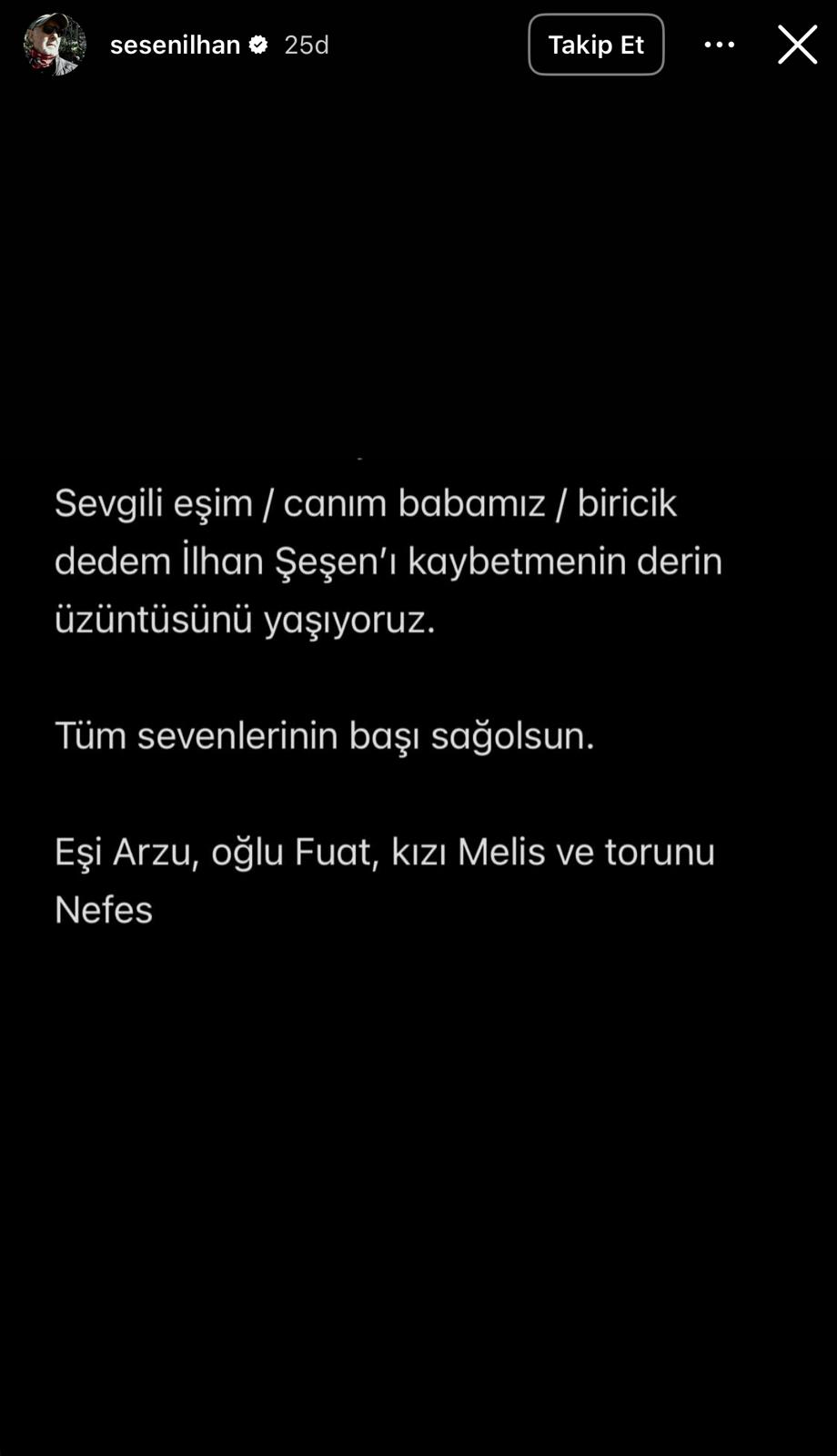 İlhan Şeşen'in sosyal medya hesabından yapılan paylaşımda "Sevgili eşim, canım babamız, biricik dedem İlhan Şeşen'i kaybetmenin derin üzüntüsünü yaşıyoruz. Tüm sevenlerinin başı sağ olsun. Eşi Arzu, oğlu Fuat kızı Melis ve torunu Nefes" ifadeleri yer aldı.