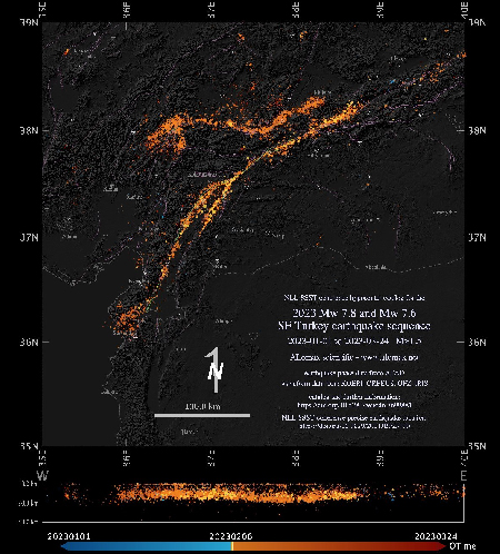 3- Artçı depremlerin dağılımı a) Kırılan fayı, b) üzerine gerilim aktarılan (tetiklenen) bölgeleri gösterir. Göksun batısından Malatya'ya, Samandağ'dan Pütürge'ye ve Narlı'dan Pazarcık'a uzanan hatları görüyorsunuz, bu hatlar boyunca bir daha deprem beklemiyoruz, bunlar kırıldı.