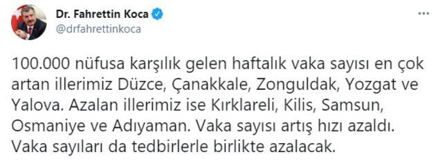 Sağlık Bakanı Fahrettin Koca, sosyal medya hesabından, vaka oranı en çok artan ve azalan illere ilişkin açıklama yaptı.