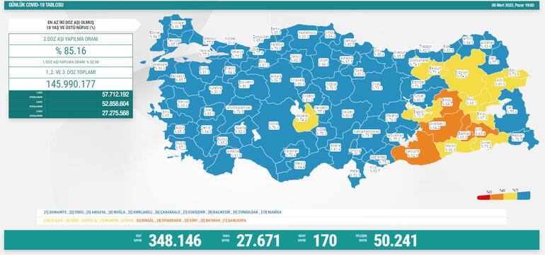 Sağlık Bakanlığı, 6 Mart Corona virüs tablosunu paylaştı. Açıklanan tabloya göre son 24 saatte 348 bin 146 Kovid-19 testi yapıldı, 27 bin 671 kişinin testi pozitif çıktı, 170 kişi hayatını kaybetti.