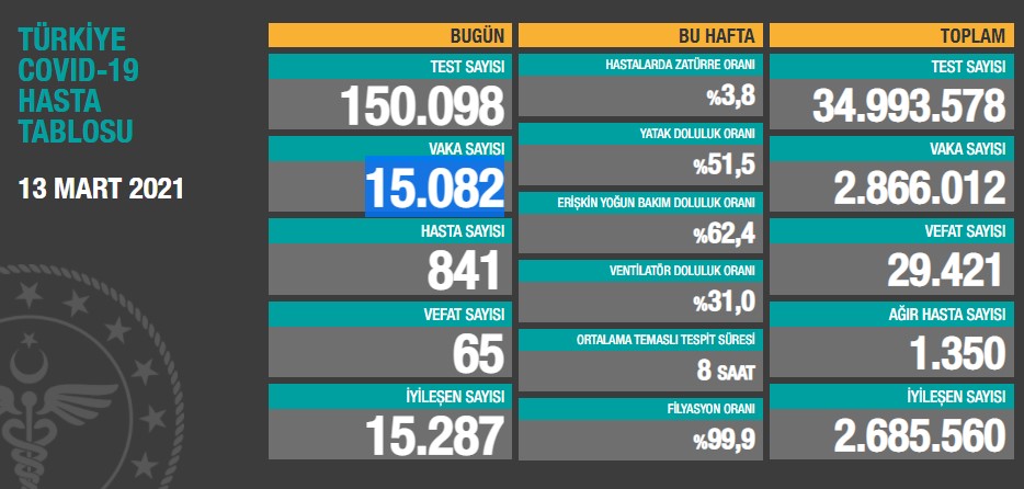 Açıklanan tabloya göre, son 24 saatte 150 bin 98 Kovid-19 testi yapıldı, 15 bin 82 kişinin testi pozitif çıktı, 65 kişi hayatını kaybetti. Ağır hasta 1350 oldu, 15 bin 287 kişinin Kovid-19 tedavisinin/karantinasının sona ermesiyle iyileşen sayısı 2 milyon 685 bin 560'a yükseldi.