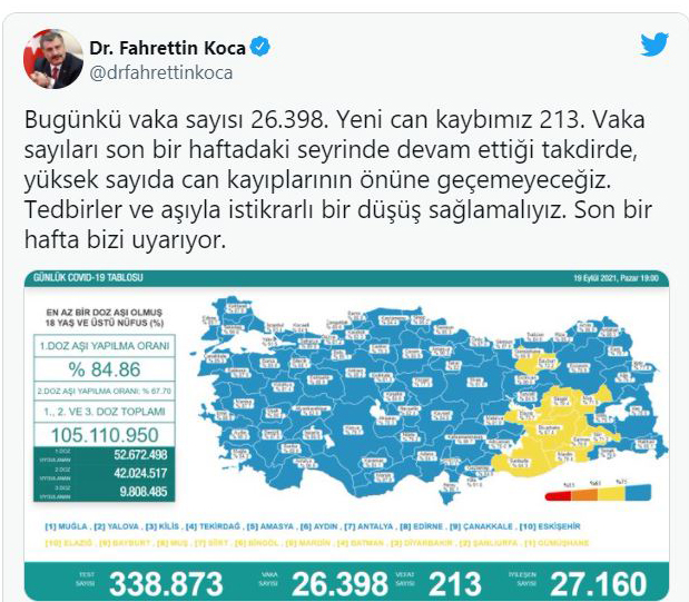 TRT Haber'in haberine göre; Delta varyantının etkisinin de yoğun şekilde hissedildiği koronavirüs vakalarında artış söz konusu. Sağlık Bakanı Fahrettin Koca son olarak, "Vaka sayıları son 1 haftadaki seyrinde devam ettiği takdirde, yüksek sayıda can kayıplarının önüne geçemeyeceğiz. Tedbirler ve aşıyla istikrarlı bir düşüş sağlamalıyız. Son 1 hafta bizi uyarıyor" açıklamasını yaptı.