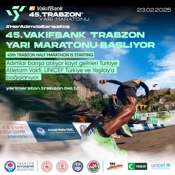 Bu sene "Her Adımda Barışa Koş" mottosuyla düzenlenecek Vakıfbank 45.Uluslararası Trabzon Yarı Maratonu, sporun birleştirici gücüyle sivil toplum kuruluşlarına destek sağlamayı hedefliyor. Katılımcılar, hem kendi sınırlarını zorlayacak hem de gençlere, çocuklara, sağlıklı yaşam bilincine katkıda bulunacak. 45 yıllık köklü geçmişiyle Trabzon Yarı Maratonu, bu yıl da ilham verici gücü ve dayanışma ruhuyla dünyanın dört bir yanına barış ve kardeşlik mesajı taşıyacak.