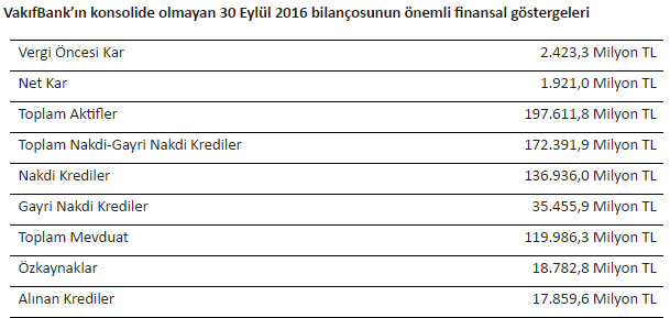 VakıfBank, 2016 yılının üçüncü çeyreğinde elde ettiği 817 milyon TL net kar ile yılın ilk dokuz ayında toplam 1 milyar 921 milyon TL net kara ulaştı. 2015 yılsonuna göre toplam kredileri, mevduatı ve aktifleri sektöre göre daha hızlı büyüyen VakıfBank’ın 198 milyar TL’ye yaklaşan aktif büyüklüğü ile ekonomiye nakdi ve gayri nakdi krediler aracılığı ile sağladığı destek 173 milyar TL’ye ulaştı. Toplam mevduatı 120 milyar TL’ye, özkaynakları 19 milyar TL’ye ulaşan VakıfBank’ın dokuz aylık ortalama özkaynak karlılığı yüzde 14.4, ortalama aktif karlılığı yüzde 1.35 seviyesine yükseldi.