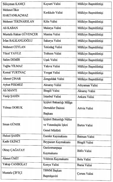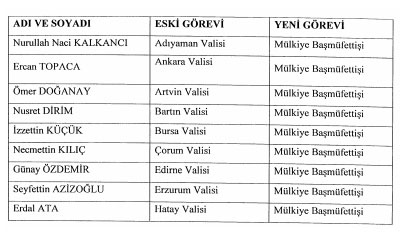 Esenler Kaymakamı Hulusi Şahin'in Batman Valiliğine, Beypazarı Kaymakamı Kadir Ekinci'nin Bingöl Valiliğine, Gaziosmanpaşa Kaymakamı Oktay Çağatay'ın Bitlis Valiliğine, Yıldırım Kaymakamı Ahmet Ümit'in Bolu Valiliğine, Şişli Kaymakamı İdris Akbıyık'ın Hakkari Valiliğine, Etimesgut Kaymakamı Fuat Gürel'in Karabük Valiliğine, İskenderun Kaymakamı Recep Soytürk'ün Kilis Valiliğine, Kayapınar Kaymakamı Ozan Balcı'nın Tokat Valiliğine, Çankaya Kaymakamı Kadir Çakır'ın da Yozgat Valiliğine atamaları yapıldı.