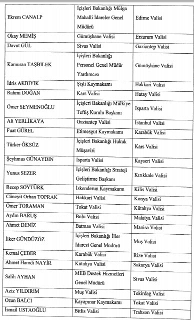 Aksaray Valisi Aykut Pekmez Adıyaman Valiliğine, Bingöl Valisi Ali Mantı Aksaray Valiliğine, İstanbul Valisi Vasip Şahin Ankara Valiliğine, Konya Valisi Yakup Canbolat Bursa Valiliğine, Gümüşhane Valisi Okay Memiş Erzurum Valiliğine, Sivas Valisi Davut Gül Gaziantep Valiliğine, Kars Valisi Rahmi Doğan Hatay Valiliğine, Gaziantep Valisi Ali Yerlikaya İstanbul Valiliğine, Isparta Valisi Şeyhmus Günaydın Kayseri Valiliğine, Hakkari Valisi Cüneyit Orhan Toprak Konya Valiliğine, Tokat Valisi Ömer Toraman Kütahya Valiliğine, Bolu Valisi Aydın Baruş Malatya Valiliğine, Batman Valisi Ahmet Deniz Manisa Valiliğine, Karabük Valisi Kemal Çeber Rize Valiliğine, Kütahya Valisi Ahmet Hamdi Nayir Sakarya Valiliğine, Muş Valisi Aziz Yıldırım Tekirdağ Valiliğine, Bitlis Valisi İsmail Ustaoğlu Trabzon Valiliğine, Rize Valisi Erdoğan Bektaş Zonguldak Valiliğine getirildi. Merkez Valisi Muammer Erol'un ise Yalova Valiliğine ataması gerçekleştirildi.