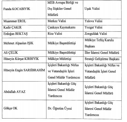 Adıyaman Valisi Nurullah Naci Nurullah Naci Kalkancı, Ankara Valisi Ercan Topaca, Artvin Valisi Ömer Doğanay, Bartın Valisi Nusret Dirim, Bursa Valisi İzzettin Küçük, Çorum Valisi Necmettin Kılıç, Edirne Valisi Günay Özdemir, Erzurum Valisi Seyfettin Azizoğlu, Hatay Valisi Erdal Ata, Kayseri Valisi Süleyman Kamçı, Kırıkkale Valisi Mehmet İlker Haktankaçmaz, Kilis Valisi Mehmet Tekinarslan, Malatya Valisi Ali Kaban, Manisa Valisi Mustafa Hakan Güvençer, Sakarya Valisi İrfan Balkanlıoğlu, Tekirdağ Valisi Mehmet Ceylan, Trabzon Valisi Yücel Yavuz, Uşak Valisi Salim Demir, Yalova Valisi Tuğba Yılmaz, Yozgat Valisi Kemal Yurtnaç ve Zonguldak Valisi Ahmet Çınar mülkiye başmüfettişi olarak görevlendirildi.