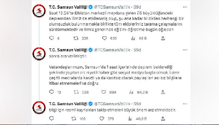 Sosyal medyada “Samsun’da bir saat içerisinde 6,3 şiddetinde deprem olacak” şeklindeki ses kaydı kısa sürede yayıldı. Samsun Valiliği, sosyal medya hesaplarından ses kaydına yönelik açıklama yaptı.