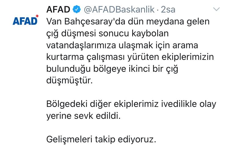 AFAD'ın sosyal paylaşım sitesi Twitter'daki hesabından yapılan açıklamada, "Van Bahçesaray'da dün meydana gelen çığ düşmesi sonucu kaybolan vatandaşlarımıza ulaşmak için arama kurtarma çalışması yürüten ekiplerimizin bulunduğu bölgeye ikinci bir çığ düşmüştür. Bölgedeki diğer ekiplerimiz ivedilikle olay yerine sevk edildi" denildi.
