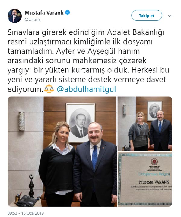 Varank’ın dün akşam twitter’dan yaptığı paylaşımla iki vatandaşı resmi “uzlaştırmacı” kimliği ile uzlaştırdığını açıkladı.