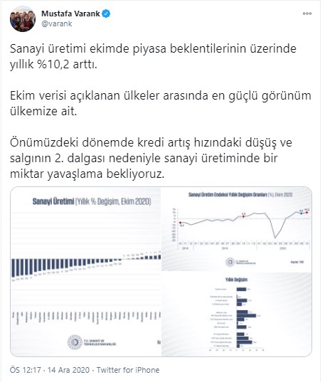 Varank, twitter hesabından bugün açıklanan sanayi üretim rakamları ile ilgili şu değerlendirmeyi yaptı: