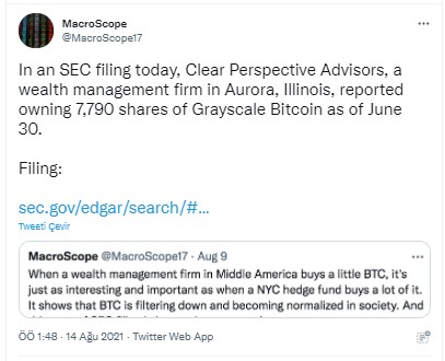 MacroScope'un gönderilerine göre söz konusu şirketler, GBTC yatırımlarını 30 Haziran 2021 ile biten dönemde açıkladı.