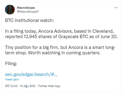 Ohio merkezli Ancora Advisors ise 30 Haziran itibarıyla 13.945 GBTC hissesi satın aldığını açıkladı.