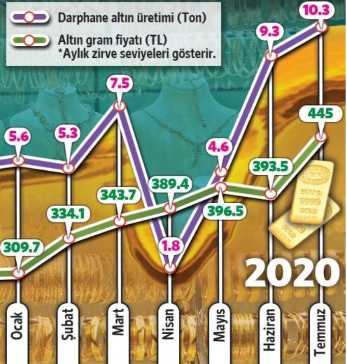 2020'nin ocak-temmuz dönemindeki altın üretimi geçen yılın aynı dönemine göre yüzde 116 artışla 44.3 tona çıktı. Geçen yıl temmuzda 400 bin çeyrek altın basılırken, rakam bu yıl 828 bine yükseldi. Halk arasında ‘Ata altını' olarak tabir edilen birlik sikke altın (7.216 gram) üretimi de dikkat çekici boyutlarda arttı.