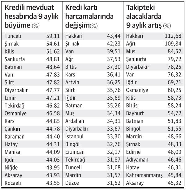 BDDK verilerine göre Hakkari'de takibe düşen alacak miktarı 2020 yıl sonuna göre yüzde 112,7 arttı, Ağrı'da yüzde 110, Muş'ta yüzde 84,5, Urfa'da yüzde 79,7, Diyarbakır'da ise yüzde 78,2 artış yaşandı takibe düşen alacaklarda. Toplam bireysel kredilerde takibe düşen kredi miktarında artış ise yüzde 21,88 oldu. En düşük artış ise Ankara'da yüzde 4, İstanbul'da yüzde 5,57 olarak hesaplandı.