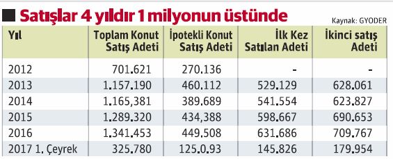 Son 3 yıldan bu yana ortalama 1 milyon üzerinde konut satışı yapan gayrimenkul geliştiricileri 2016 yılında olduğu gibi 2017’de de büyümesini sürdürdü. Gayrimenkul sektörü 2016 yılı sonunda, toplam 1 milyon 341 bin 453 adet konut satışı ile 2015 rakamlarının aşmıştı. Konut satışları bu yılın ilk çeyreğinde artmaya devam etti. 2017’nin ilk üç ayında satışlar yüzde 7 artarak 325 bin konuta gelirken, yıl sonunda ise bu oranın 1.5 milyona çıkması, büyümenin ise yüzde 5-6 arasında olması bekleniyor.