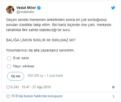 Vedat Milor, dün kişisel Twitter hesabında yaptığı paylaşımda takipçilerine "Geçen seneki menemen anketinden sonra en çok sorduğunuz soruları özellikle takip ettim. Biri bariz biçimde öne çıktı. Herkesin rahatlıkla fikir sahibi olabileceği bir soru: Balığa limon sıkılır mı?" sorusunu yöneltti.