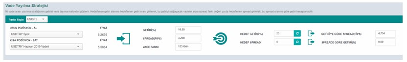 Bu araştırma aracında yer alan vade yayılma stratejisi bölümünde ise, aynı para biriminde farklı vadelerde bir kısa bir uzun pozisyonda işlem yapıldığı zaman aradaki spread farkının, kontratlar arasındaki vade farkına göre yarattığı faiz farkını hesaplayabilirsiniz. Veya hedeflediğiniz getiriye göre arada olması gereken spread farkını da hesaplayabilirsiniz.